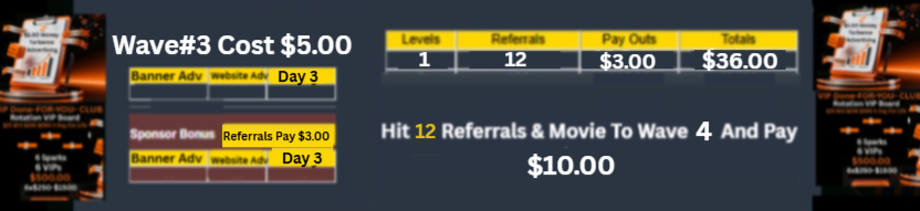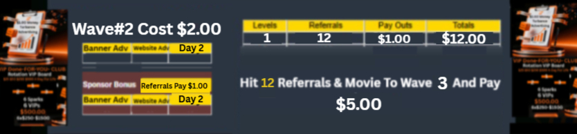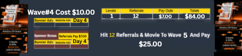 Look at the chart below to get an idea of the income you can make. With the inexpensive start up cost most will be able to accomplish considerable growth in Wave 1. But for explanation purposes and ease of calculations we will use your referred 10 who also referred 10 each.