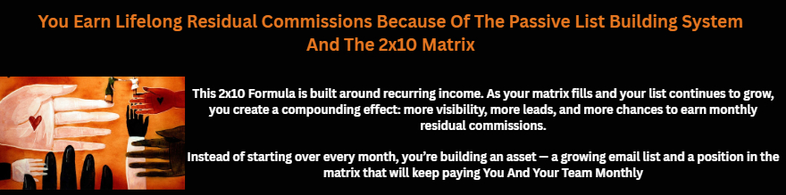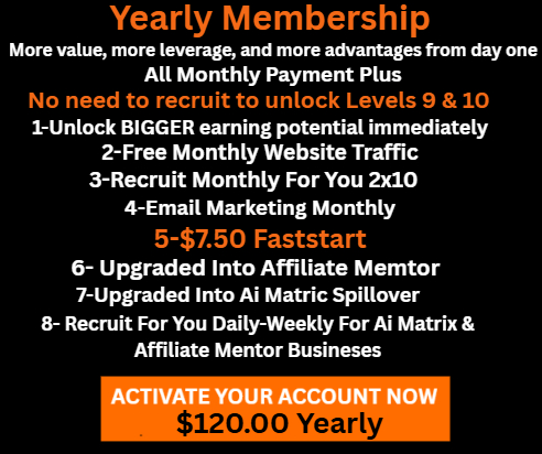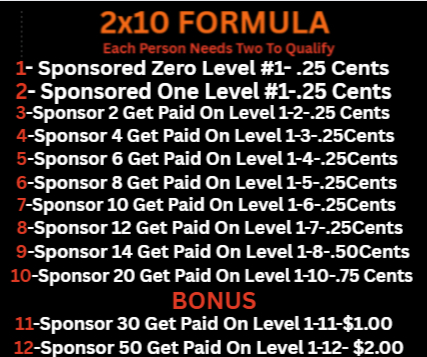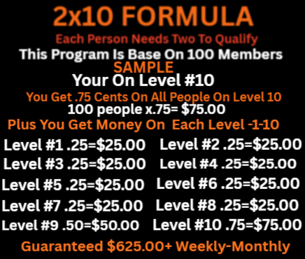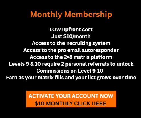 This 2×10 Matrix showcases the incredible income potential that can unfold as positions fill throughout your organization. Powered by team growth, duplication, ThIS matrix can grow across 10 levels — unlocking the potential to earn up to $3072.00 per month. This is what makes the opportunity so exciting: as your team expands and momentum builds, each filled level can add to your residual income potential and create a powerful path toward long-term growth.